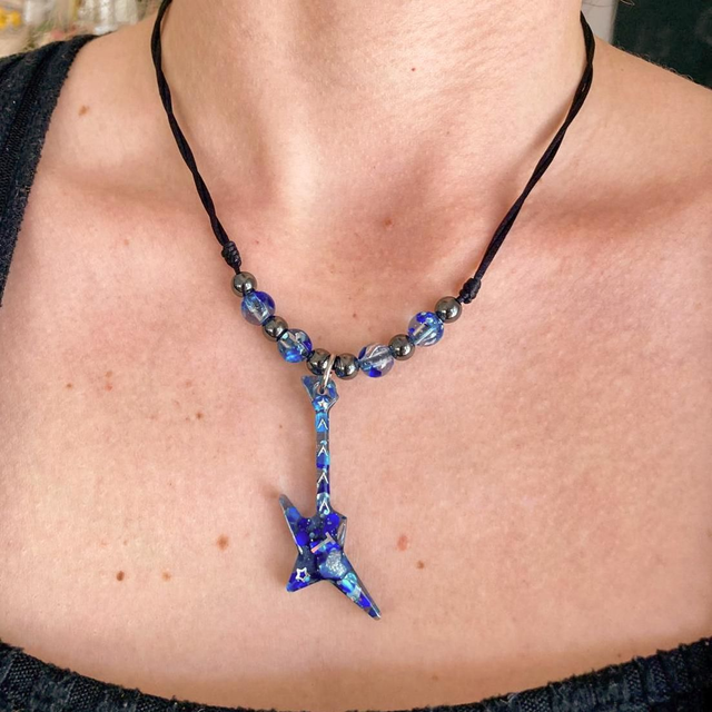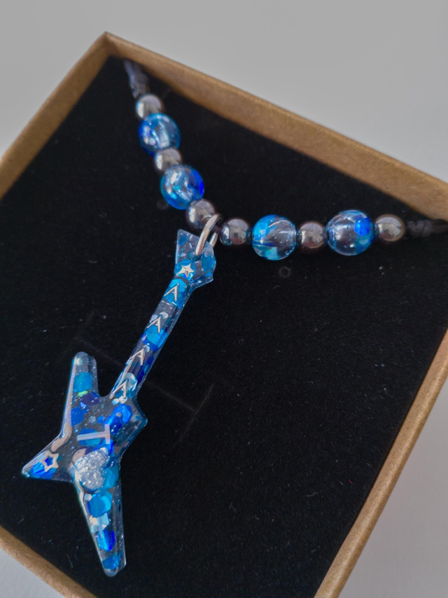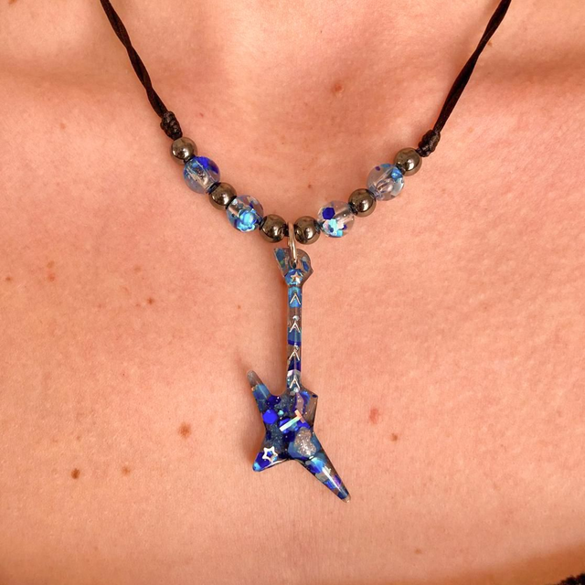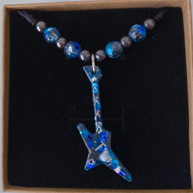 Su colgante de guitarra eléctrica, con destellos que recuerdan al mar y al cielo, convierte cada pieza en algo único.