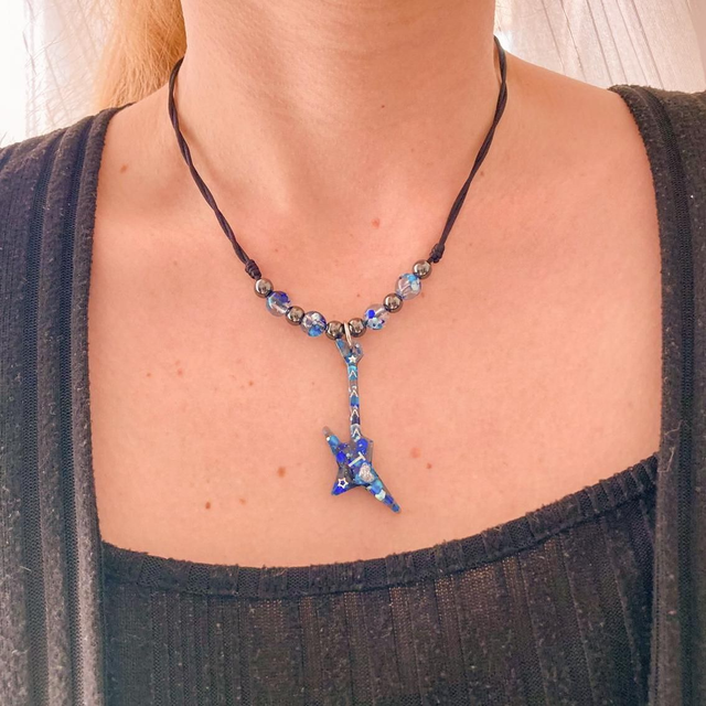 Este collar artesanal en tonos azules está pensado para personas libres, creativas y auténticas.