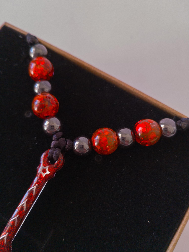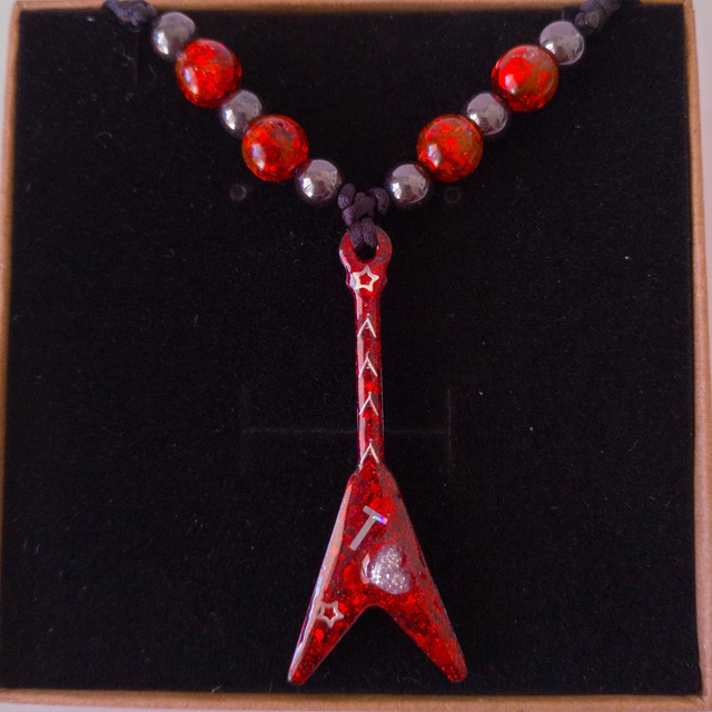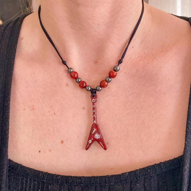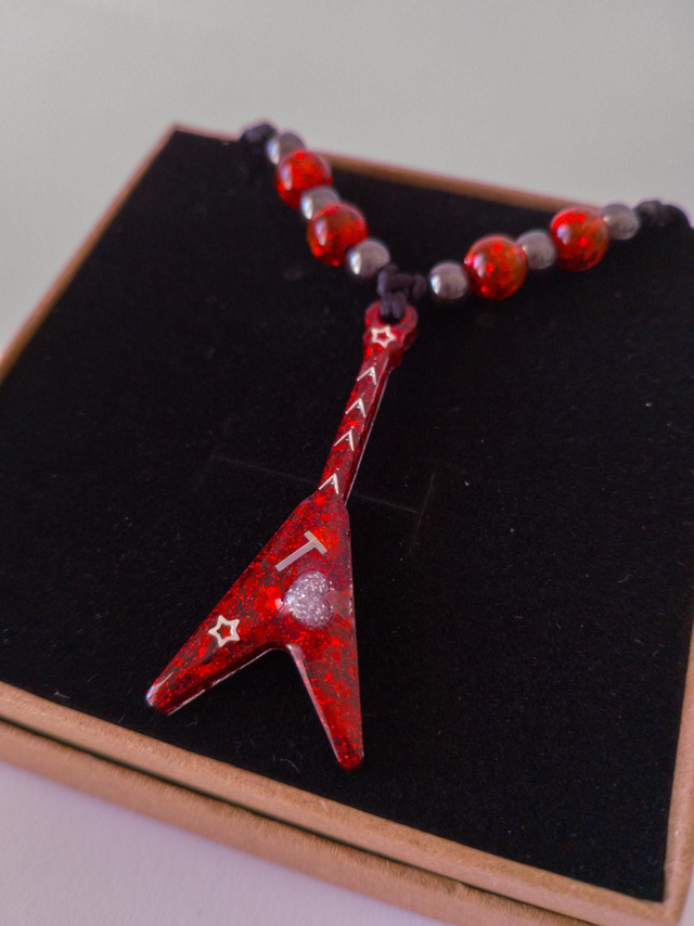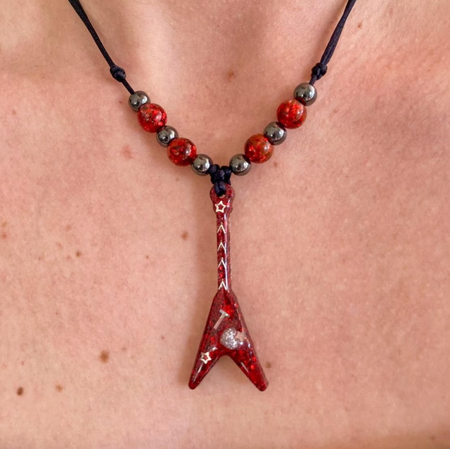 Este collar artesanal en tonos rojos intensos está pensado para personas que sienten fuerte y no se esconden. Su colgante con forma de guitarra eléctrica transmite pasión, carácter y una energía arrolladora.