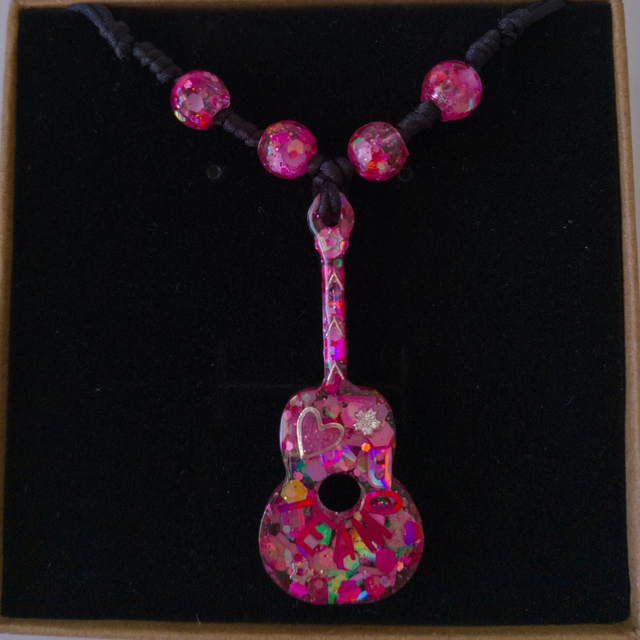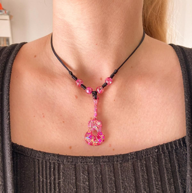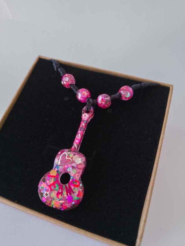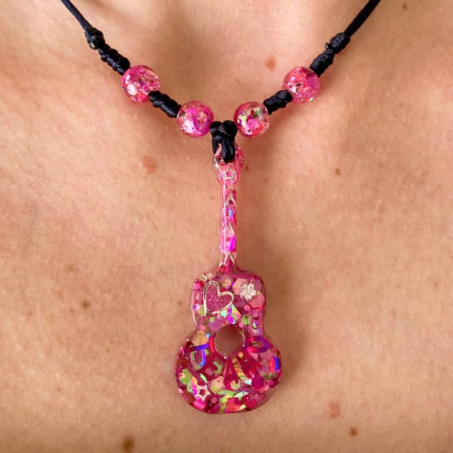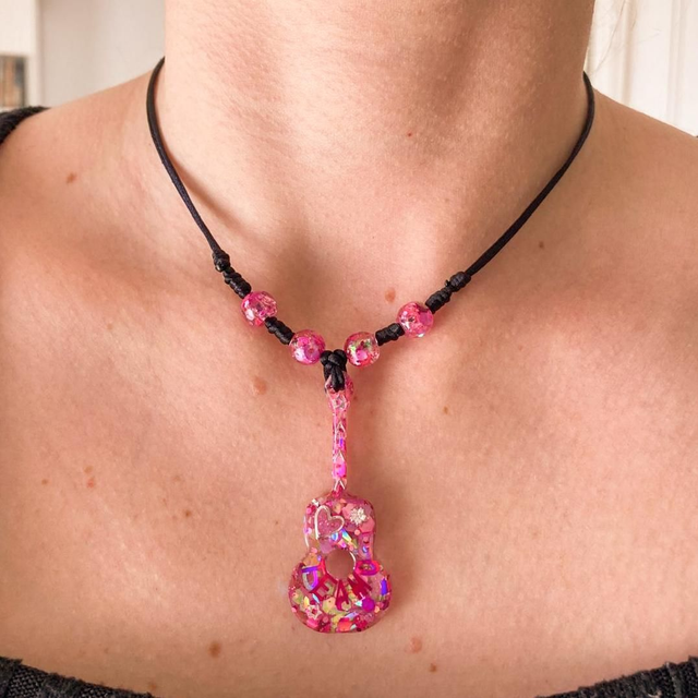 Hecho a mano en tonos rosas luminosos, su colgante de guitarra simboliza el amor fuerte, la ternura y los sentimientos sinceros. Es delicado, pero con mucha personalidad.
