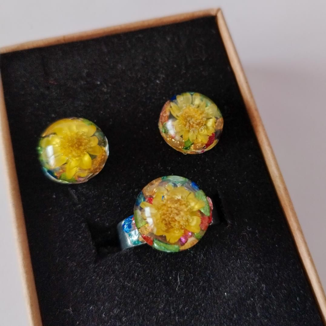 Sus piezas, realizadas a mano con resina uv y técnica de encapsulado, con terminaciones de acero inoxidable, tanto para los pendientes de tipo botón como para la base del anillo, que te permitirán lucirlos en cualquier ocasión, ya que su comodidad y elegancia los hace perfectos para tu día a día o para eventos formales y especiales.