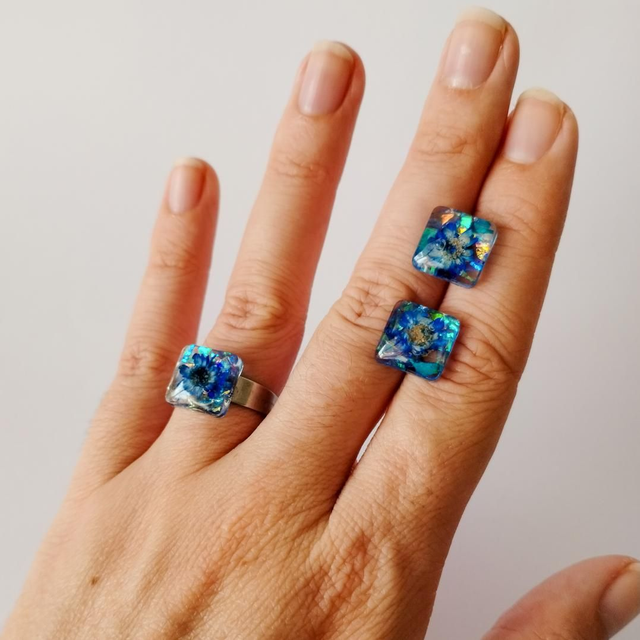 Realizado a mano con resina y técnica de encapsulado de flores con fondo de brillo que realza los colores dando un toque llamativo pero agradable.
