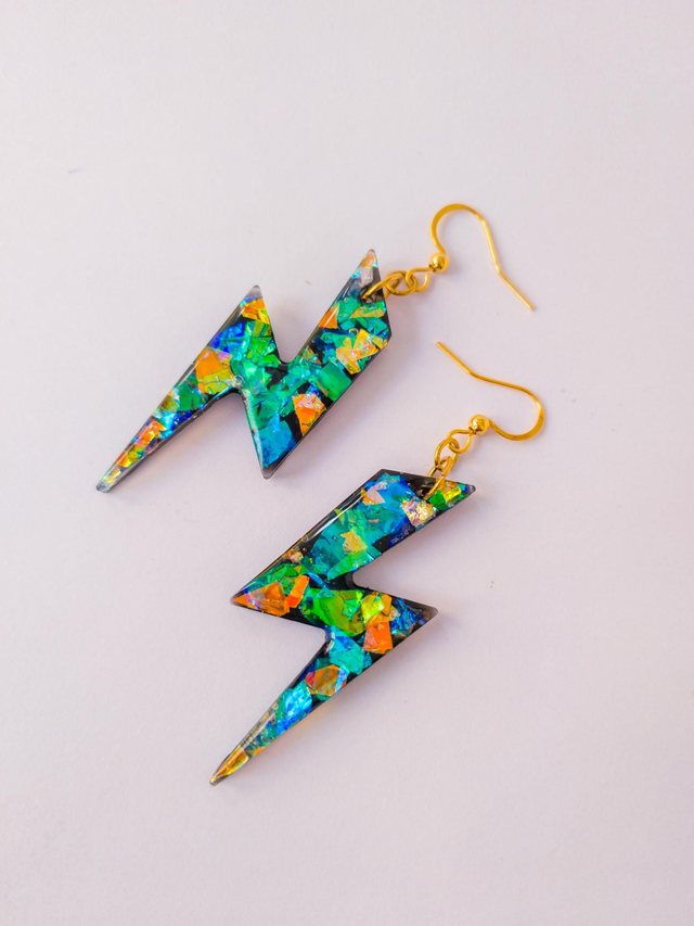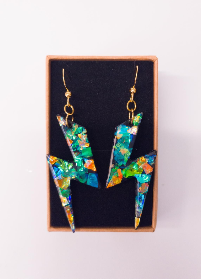 Preciosos pendientes de rayos con un efecto brillante y fondo oscuro, realizadas a mano con resina uv y ganchos en acero inoxidable.